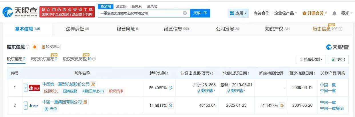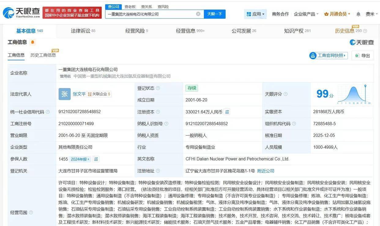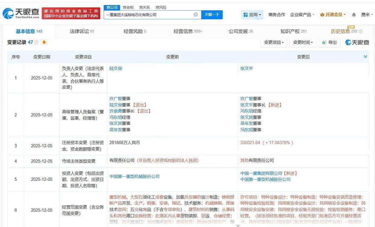 天眼查App显露,近日,一重集团大连核电石化有限公司发生工商变更,新增中国一重集团有限公司为鼓动,注册本钱由约28.2亿东说念主民币增至约33亿东说念主民币,增幅约17%,同期,陆文俊卸任法定代表东说念主,许崇勇卸任董事长,均由张文平接任。